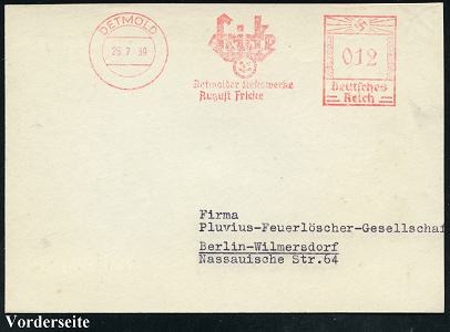 8782 | 14 € | PL-Raum 49.. (ohne Herford) : DETMOLD/ Fricke/ Detmolder Kekswerke/ August Fricke 1939 (25.7.) AFS Francotyp "Hakenkkreuz", A.G. entfernt!, vergl. Kat.-Nr.8780 (Logo) kleine Bedarfs-Vorderseite (Dü.E-3CE) | ![]() | |