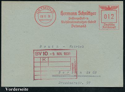 8783 | 15 € | PL-Raum 49.. (ohne Herford) : DETMOLD/ Hermann Schmittger/ Polstergestell-u./ Stahldrahmatratzen-Fabrik.. 1939 (8.11.) AFS Francotyp "Reichsadler" , kleine Bedarfs-Vorderseite (Dü.E-5CGo) | ![]() | |