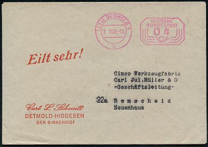 8786 | 8 € | PL-Raum 49.. (ohne Herford) : (21a) DETMOLD 1/ a/ DEUTSCHE/ BUNDESPOST 1952 (3.11.) PFS Achteck "Posthorn" auf Firmen-Bf.: Curt L. Schmidt, DETMOLD-HIDDESSEN, DER BIRKENHOF (Dü.D-16, Nr.272) | ![]() | |
