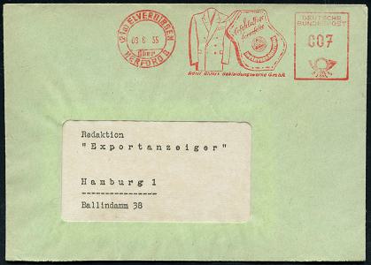 8797 | 15 € | PL-Raum 49.. (ohne Herford) : (21a) ELVERDISSEN/ über/ HERFORD/ Adolf Ahlers Bekleidungswerke GmbH 1955 (9.6.) dekorativer AFS Francotyp "Posthorn" = PSt I.-Typ (Herren-Jacke u. Logo) Fern-Bf. (Dü.E-23CG) | ![]() | |