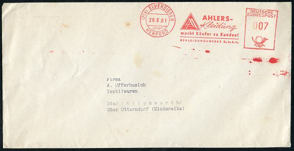 8798 | 12 € | PL-Raum 49.. (ohne Herford) : (21a) ELVERDISSEN/ über/ HERFORD/ AHLERS-/ Kleidung.. 1961 (28.6.) AFS Francotyp "Posthorn" = PSt I-Typ (Monogr.Logo) Fern-Bf. (Dü.E-23CO) | ![]() | |