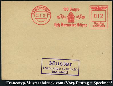 8799 | 35 € | PL-Raum 49.. (ohne Herford) : ENGER (WESTF)/ 100 Jahre/ ..Hch.Barmeier Söhne 1938 (22.3.) Jubil.-AFS-Musterabdruck Francotyp "Reichsadler" (Fachwerkhaus) glasklar gest. Francotyp-Musterblatt vom (Vor)-Ersttag !, selten! (Dü.E-5CGo) | ![]() ![]() | |