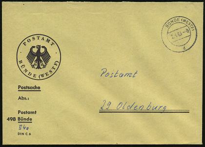 8778 | 12 € | PL-Raum 49.. (ohne Herford) : BÜNDE (WESTF)/ d 1962 (22.6.) aptierter 2K-Steg = alte PLGZ entfernt , Postdienstbf., Ortsdruck mit neuer PLZ 498 Bünde, schöne Übergangs-Kombination! | ![]() | |
