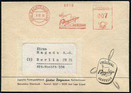 8807 | 15 € | PL-Raum 49.. (ohne Herford) : (21a) KACHTENHAUSEN/ 50 Jahre/ Bergmann/ GESTELLE.. 1955 (3.12.) AFS Francotyp "Posthorn" mit alter Zählnr. , Firmen-Bf.: Lippische Polstergestellfabrik Gustav Bergmann.. mit Firmen-Logo (Dü.E-23CEh = alte Zählnr.!) | ![]() | |