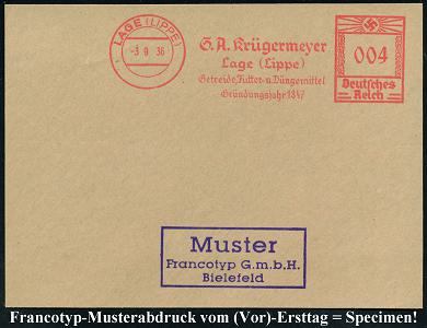 8810 | 35 € | PL-Raum 49.. (ohne Herford) : LAGE (LIPPE)/ G.A.Krügermeyer../ Getreide,Futter-u.Düngemittel.. 1936 (3.9.) AFS-Musterabdruck Francotyp "Hakenkreuz" , glasklar gest. Francotyp-Musterblatt vom (Vor)-Ersttag !, selten! (Dü.E-3CEo) | ![]() ![]() | |