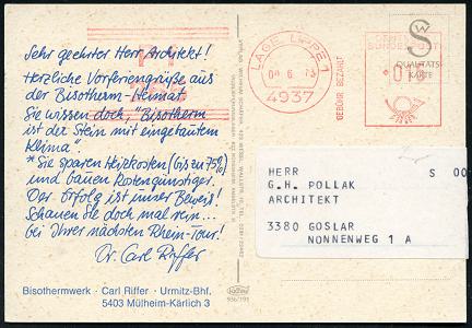 8811 | 12 € | PL-Raum 49.. (ohne Herford) : 4937 LAGE,LIPPE 1/ GEBÜHR BEZAHLT/ Pf./ 265 1973 (Juni) anonymer AFS Francotyp 015 Pf. = Massen-Drs.-Porto! , Reklame-Ak. (Koblenz): Bisothermwerk Carl Ritter.. 5403 Mülheim-Kärlich 3 (betr. Energiesparen) (Dü.E-26) | ![]() ![]() | |