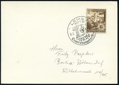 8813 | 18 € | PL-Raum 49.. (ohne Herford) : LEMGO/ 1933-1939/ 6.Erinnerungstreffen 1939 (15.1.) SSt = NS-Flagge vor Hermanns-Denkmal auf EF WHW 3 + 2 Pf. , Inl.-Drs.-Karte (Bo.4, Bochmann vom 15.1. unbekannt !) | ![]() | |
