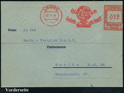 8814 | 15 € | PL-Raum 49.. (ohne Herford) : LEMGO/ WRENGER/ Gestelle-ein Begriff 1941 (23.7.) AFS Francotyp "Hakenkreuz" (Globus auf Gestell) links etw. knapp geschnittene Bedarfs-Vorderseite (Dü.E-3CEo) | ![]() | |