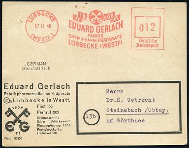 8829 | 18 € | PL-Raum 49.. (ohne Herford) : LÜBBECKE/ (WESTF.)/ 1868/ EDUARD GERLACH/ FABRIK/ CHEM.-PHARM:PRÄPARATE.. 1946 (7.11.) aptierter AFS Francotyp "Reichsadler" = entfernt = Notmaßnahme! (Schlüssel-Logo) gering verkürzte, motivgl. Firmen-Kt. (Reg.-Lochung geschl.) n. Steinebach/ Obbay. (Dü.E-13 J-129o) | ![]() | |