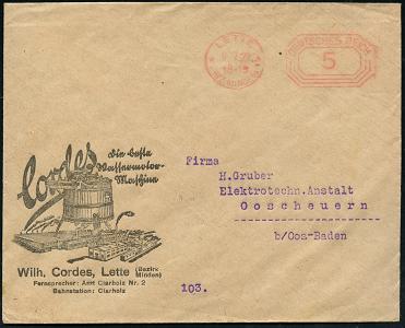 8841 | 20 € | PL-Raum 49.. (ohne Herford) : Minden-Lette 1929 (9.7.) PFS "Achteck": LETTE/**/(BZ. MINDEN)/ DEUTSCHES REICH, 5 Pf. auf Reklame-Bf.: Cordes, die beste Wassermotor-Maschine.. (Tetxt teils Sütterlin) mit Fabrikgelände (Dü.D-4) | ![]() | |