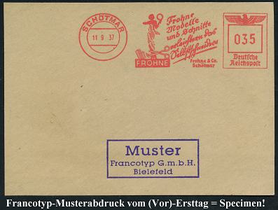 8870 | 35 € | PL-Raum 49.. (ohne Herford) : SCHÖTMAR/ Frohne/ Modelle/ u.Schnitte/ erleichtern das/ Selbstschneidern/ Frohne & Co.. 1937 (11.9.) AFS-Musterabdruck Francotyp "Reichsadler", Text teils Sütterlin (Frauenfigur, Schere) glasklar gest. Francotyp-Musterblatt vom (Vor)-Ersttag !, selten! (Dü.E-5CGo) | ![]() ![]() | |