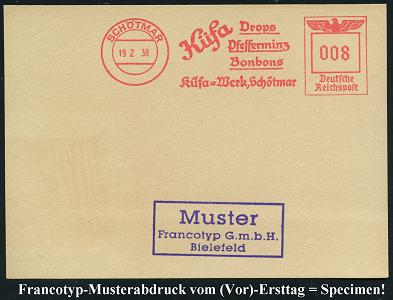 8871 | 35 € | PL-Raum 49.. (ohne Herford) : SCHÖTMAR/ Küfa/ Drops/ Pfefferminz/ Bonbons/ Küfa-Werk.. 1938 (19.2.) AFS-Musterabdruck Francotyp "Reichsadler" , glasklar gest. Francotyp-Musterblatt vom (Vor)-Ersttag !, selten! (Dü.E-5CGo) | ![]() ![]() | |