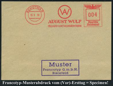 8872 | 35 € | PL-Raum 49.. (ohne Herford) : SCHÖTMAR/ AW/ AUGUST WULP/ CELLULOID-U.METALLWAREN-FABRIK 1939 (15.5.) AFS-Musterabdruck "Reichsadler" (Monogr.-Logo) glasklar gest. Francotyp-Musterblatt vom (Vor)-Ersttag !, selten! (Dü.E-5CGo) | ![]() ![]() | |