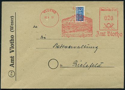 8879 | 18 € | PL-Raum 49.. (ohne Herford) : VLOTHO/ ..schöner/ Weser-Luftkurort/ Amt Vlotho 1951 (19.4.) ungenormter AFS Francotyp "Posthorn" auf 2 Pf. NoB = Vorausentwertung (Motiv: Ortsbild mit Werser-Brücke) kommunaler Dienst-Bf.: Amt Vlotho.. (Dü.E-20CGh, ungenormt) | ![]() | |