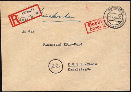 8785 | 16 € | PL-Raum 49.. (ohne Herford) : DETMOLD 1/ a 1946 (9.1.) 2K-Steg + roter Ra.2: Gebühr/bezahlt + RZ: (21) Detmold 1/w , klar gest. Fern-R-Bf. n. Köln | ![]() | |