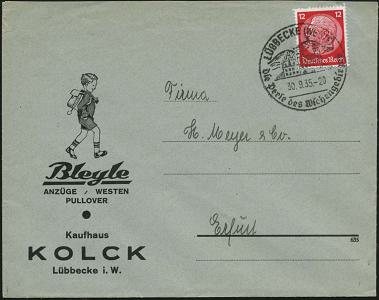 8825 | 20 € | PL-Raum 49.. (ohne Herford) : LÜBBECKE (WESTF)/ Die Perle des Wiehengebirges 1938 (27.1.) HWSt (Schloß) auf Reklame-Bf.: Bleyle ANZÜGE.. Kaufhaus KOLCK.. = Schuljunge mit Ranzen, dekorativer Fern-Bf. (Bo.1, Letzjahr) | ![]() | |