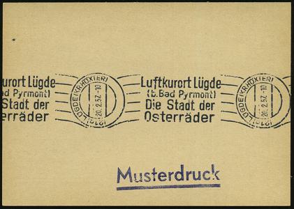 8838 | 18 € | PL-Raum 49.. (ohne Herford) : LÜGDE (KR HÖXTER)/ Luftkurort../ Die Stadt d./ Osterräder 1957 (20.2.) RoWellenSt + 1L: "Musterdruck" (wahrscheinlich) vom Letzttag auf OPD-Archiv-Musterkt.! (C 154) = Unikat! (Bo.1 Ro, Letztjahr) | ![]() | |