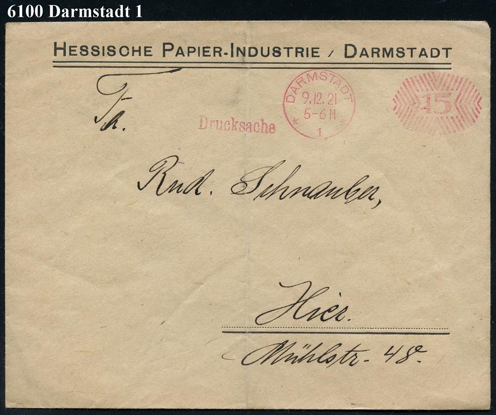 1111 | 18 € | 6100 Darmstadt Post-Freistempel : DARMSTADT/ * 1 */ 15 1921 (9.12.) roter Infla-PFS "Ziermuster" 15 Pf. auf Firmen-Bf.: HESSISCHE PAPIER-INDUSTRIE.. (Dü.D-1, Nr.8) | ![]() ![]() | |