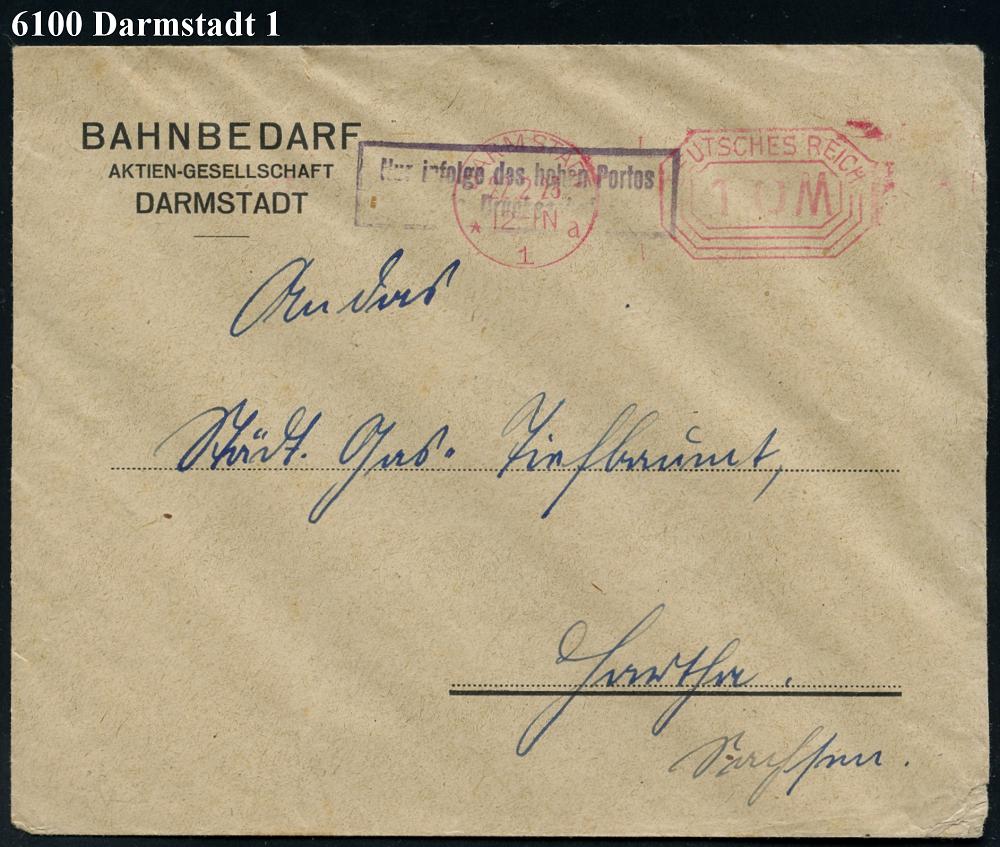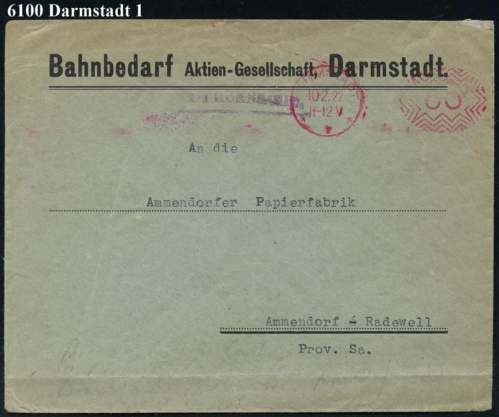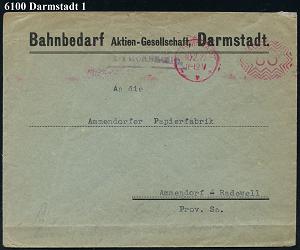 1112 | 50 € | 6100 Darmstadt Post-Freistempel : DARMSTADT/ *1*/ 60 1922 (10.2.) roter PFS "Ziermuster" 60 Pf. auf Firmen-Bf.: Bahnbedarf AG.. (unten schwache Falte) lt. Dürst-Katalog von 1922 mit 4-fach-Bewertung = 120.- DM, 1980), seltener Beleg! (Dü.D-1, Nr.12) | ![]() ![]() | |