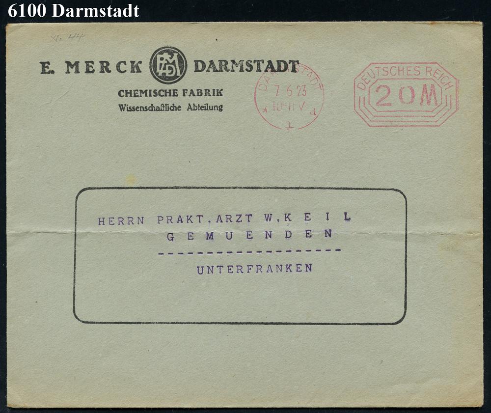 1114 | 15 € | 6100 Darmstadt Post-Freistempel : DARMSTADT/ *1a/ DEUTSCHES REICH 1923 (7.6.) Infla-PFS "Achteck" 20 M(ark) auf Firmen-Bf.: E. MERCK.. CHEMISCHE FABRIK.. (Querfalte) n. Gemünden (Dü.D-3, Nr.44) | ![]() ![]() | |
