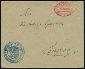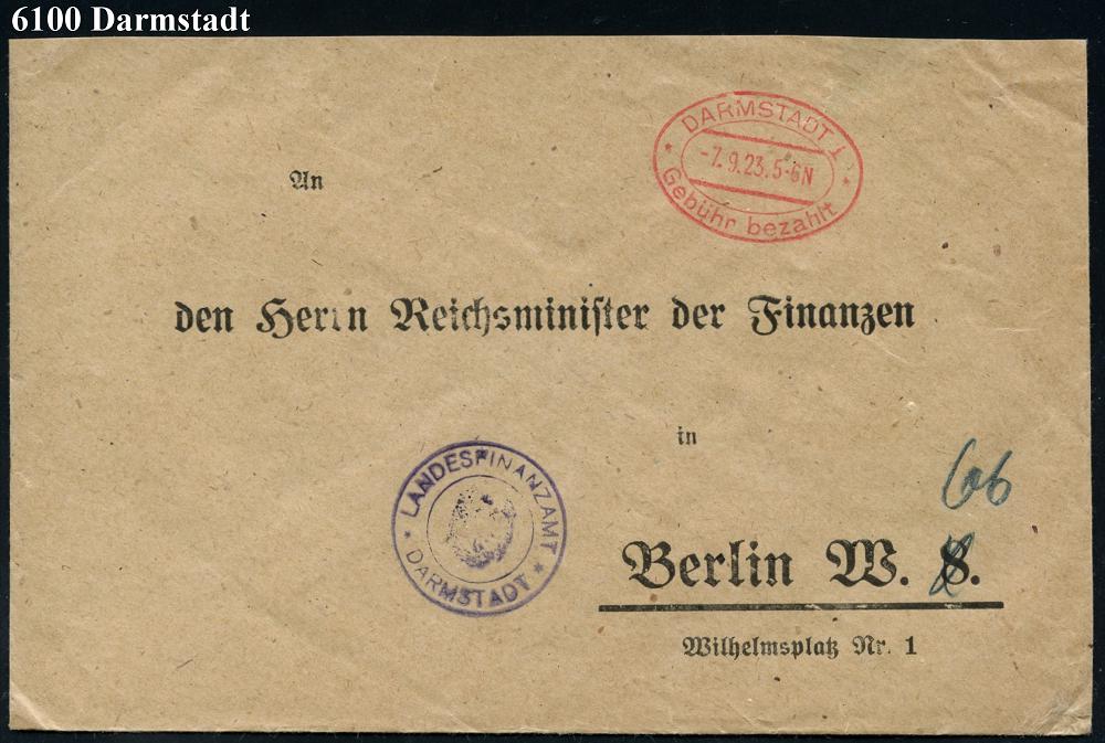 1115 | 18 € | 6100 Darmstadt Post-Freistempel : DARMSTADT/ * */ Gebühr bezahlt 1923 (7.9.) Infla-Hand-PFS "Doppeloval-Steg" + 2K-HdN: LANDESFINANZAMT/ DARMSTADT , Dienst-Vordruck-Bf.: Reichsminister der Finanzen, Berlin.. (Dü.A-5, Nr.20) | ![]() ![]() | |