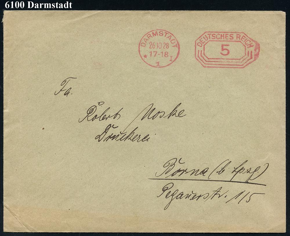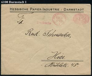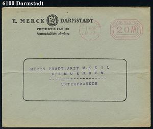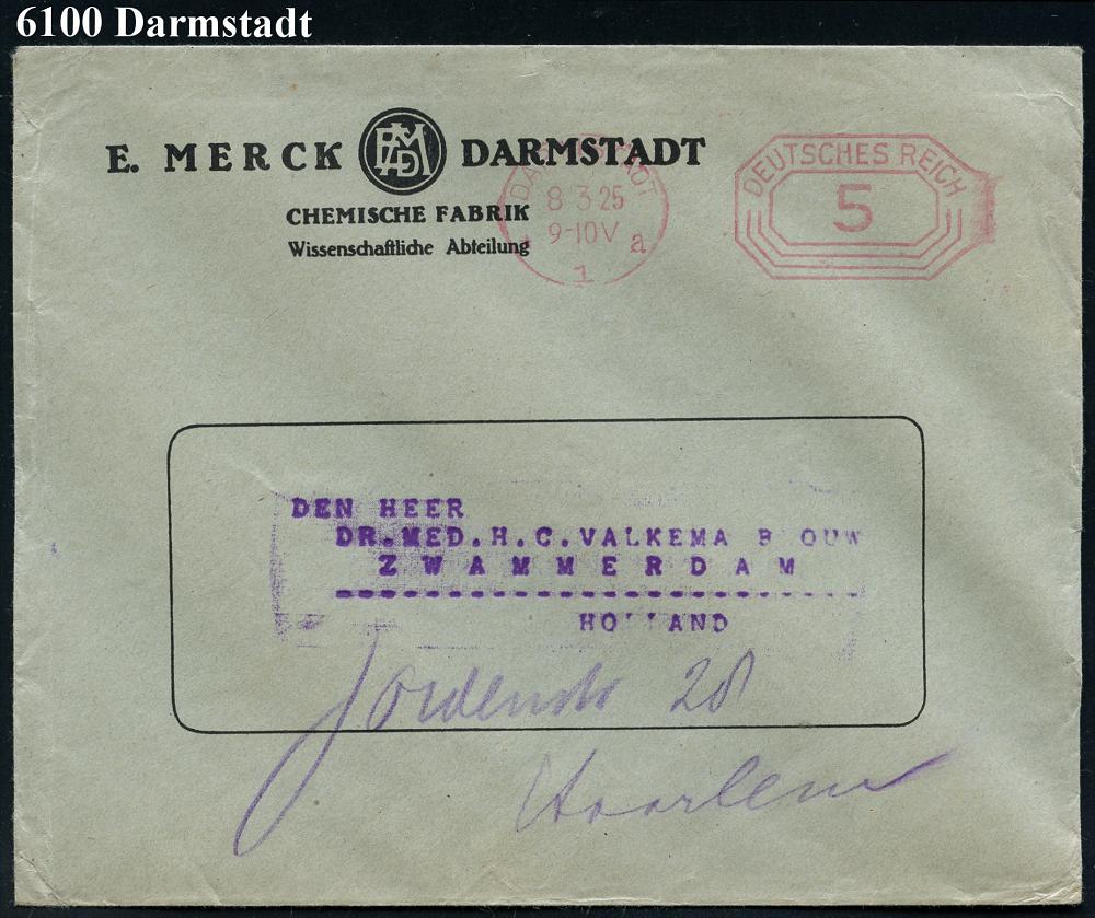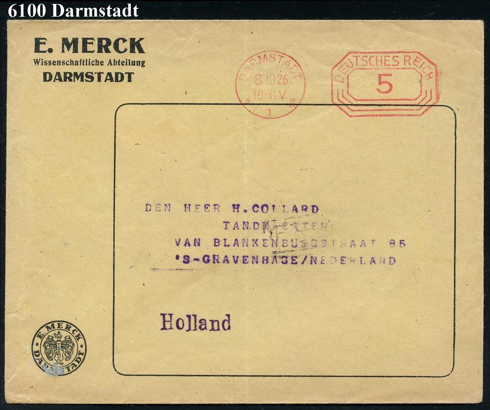 1121 | 12 € | 6100 Darmstadt Post-Freistempel : DARMSTADT/ *1II/ DEUTSCHES REICH 1926 (8.10.) PFS "Achteck" 5 Pf. auf Firmen-Bf.: E. MERCK, Wissenschaftl. Abteilung.., Ausl.-Drs. n. Holland (Dü.D-4) | ![]() ![]() | |