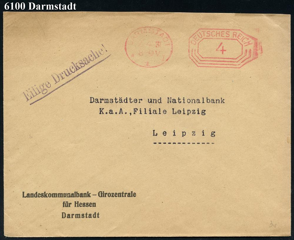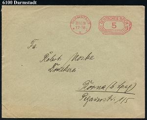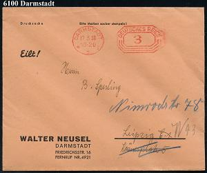 1125 | 10 € | 6100 Darmstadt Post-Freistempel : DARMSTADT/ *1I/ DEUTSCHES REICH 1938 (17.3.) PFS 3 Pf. "Achteck" auf Firmen-Bf.: WALTER NEUSEL.. (Dü.D-4) | ![]() ![]() | |