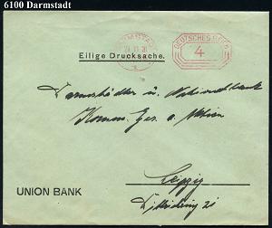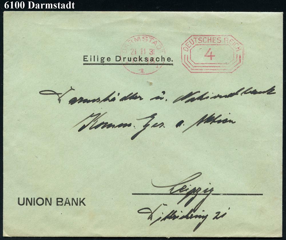 1124 | 10 € | 6100 Darmstadt Post-Freistempel : DARMSTADT/ *1I/ DEUTSCHES REICH 1931 (24.11.) PFS 4 Pf. "Achteck" auf Firmen-Bf.: UNION BANK (Dü.D-4) | ![]() ![]() | |