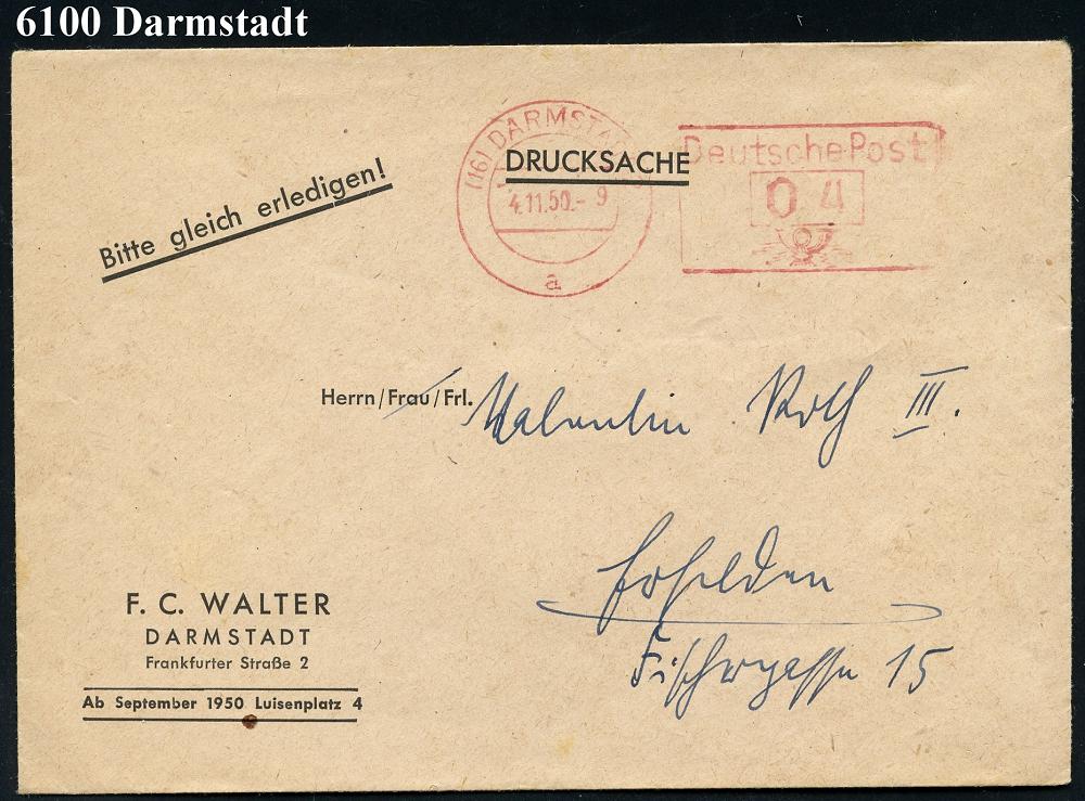 1126 | 10 € | 6100 Darmstadt Post-Freistempel : (16) DARMSTADT 2/ a/ Deutsche Post 1950 (4.11.) PFS "Deutsche Post" (Kleinbuchstaben) mit Posthorn 04 Pf. (verbunden mit Wertrahmen) Firmen-Bf.: F. C. WALTER.. (Dü.D-14, Nr.265) | ![]() | |