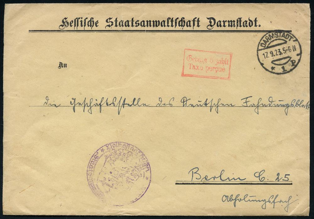 1116 | 25 € | 6100 Darmstadt Post-Freistempel : DARMSTADT/ *1p 1923 (17.9.) 1K-Bücke + roter Ra.2: Gebühr bezahlt/ Taxe percue + viol. Dienst-HdN: V o l k s s t a a t Hessen/ Staatsanwaltschaft (unten teils undeutl.) Vordr.-Bf.: Hessische Staatsanwaltschaft.., Barfrankatur-Fernbf. der Hoch-Inflation! (n. Berlin) | ![]() | |