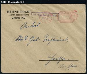 1113 | 15 € | 6100 Darmstadt Post-Freistempel : DARMSTADT/ *1a/ DEUTSCHES REICH 1923 (22.3.) Infla-PFS "Achteck" 10 M(ark) auf Firmen-Bf.: BAHNBEDARF AG.. (Dü.D-3, Nr.39) | ![]() ![]() | |