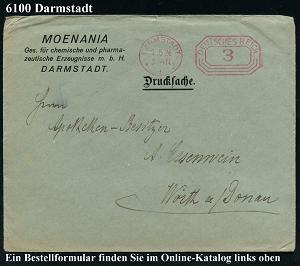 1120 | 12 € | 6100 Darmstadt Post-Freistempel : DARMSTADT/ *1I/ DEUTSCHES REICH 1926 (1.5.) PFS 3 Pf. "Achteck" auf Firmen-Bf.: MOENANIA Ges. für chemische u. pharmazeut. Erzeugnisse.. (Dü.D-4) | ![]() ![]() | |