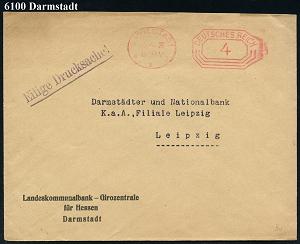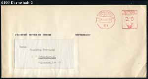 1131 | 10 € | 6100 Darmstadt Post-Freistempel : 61 DARMSTADT 2/ mp/ DEUTSCHE/ BUNDESPOST 1966 (15.8.) PFS "Posthorn" 20 Pf. mit neuer PLZ auf Firmen-Bf. "Briefdrucksache" (Dü.D-17 ovale Ziffern) | ![]() | |