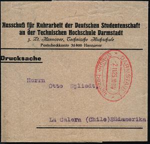 1117 | 40 € | 6100 Darmstadt Post-Freistempel : DARMSTADT/ **/ Gebühr bezahlt 1923 (2.11.) Hand-PFS "Doppeloval-Steg" auf Zeitungs-Streifband: Ausschuß für Ruhrarbeit der Deutschen Studentenschaft.. (TH Darmstadt) = alliierte Rheinland-Besetzung! , sehr seltenes Übersee-Zeitungs-Streifband n. Chile!, seltene Destination, Zeitgeschichte! (Dü.20) | ![]() | |