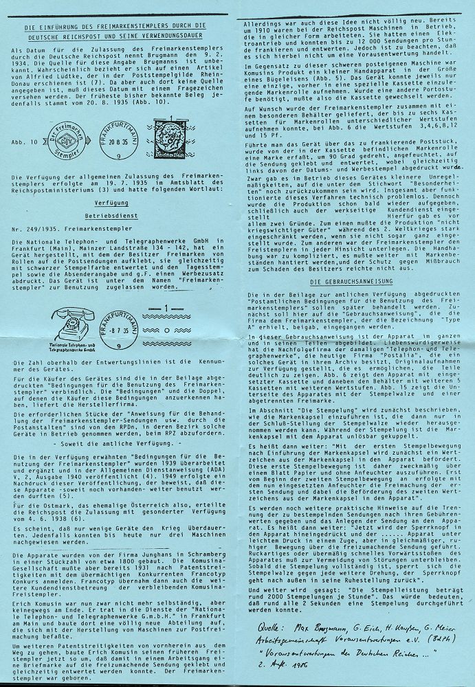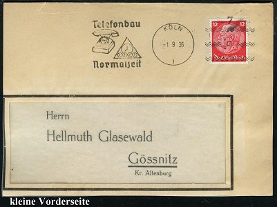8910 | 20 € | 5000 KÖLN (Allgem. Teil, Tagesstempel, Ganzsachen etc.) : KÖLN/ 1/ =7=/ TN/ Telefonbau u./ Normalzeit AG. 1936 (1.9.) Freimarkenstempel des Herstellers des Frankier- u. Entwertungs-Apparates! (Firmenlogo) auf EF 12 Pf. Hindenbg., kleine Bedarfs-Voderseite, seltene Vorausentwertung! (Mi.519) | ![]() ![]() ![]() | |
