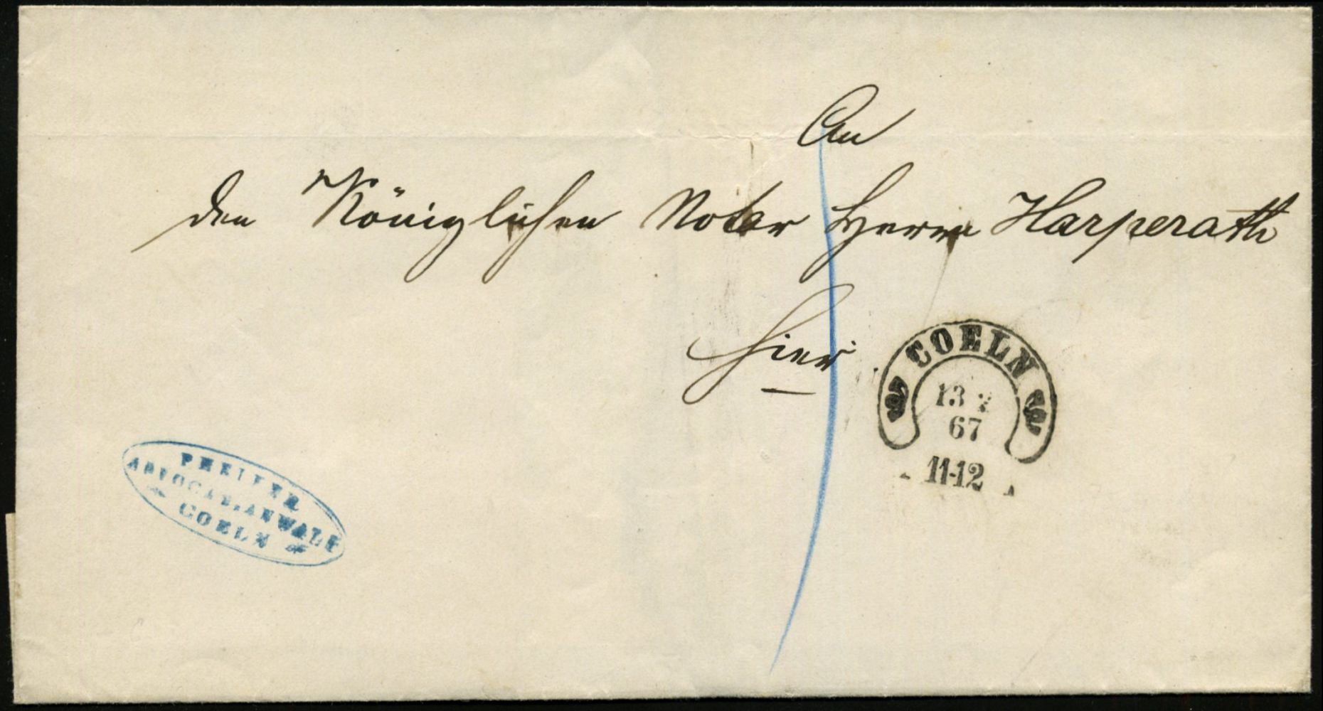 8883 | 18 € | 5000 KÖLN (Allgem. Teil, Tagesstempel, Ganzsachen etc.) : Köln 1867 (13.7.) kleiner H u f e i s e n - Stempel: C O E L N mit 2 Posthörern , klar gest. unfrankierte Orts-Justiz-Briefhülle | ![]() | |