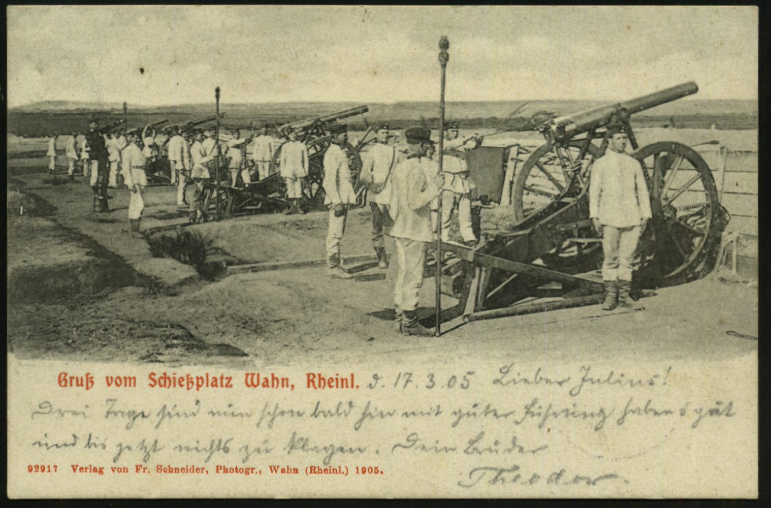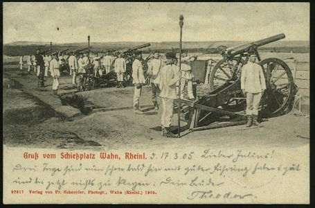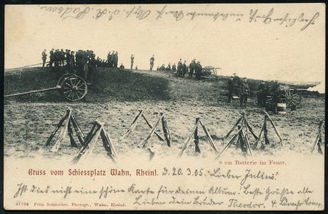 8887 | 14 € | 5000 KÖLN (Allgem. Teil, Tagesstempel, Ganzsachen etc.) : Köln-Wahn 1905 (17.3.) 1K-Gitter: WAHN (Rheinl.)-/SCHIESSPLATZ auf s/w.-Foto-Ak.: Gruß vom Schießplatz Wahn.. = Batterie, Kaliber 12 cm, feuerbereit , klar gest. Bedarfs-Kt. n. Kappeln, vs. AS (Mi.70) | ![]() ![]() | |