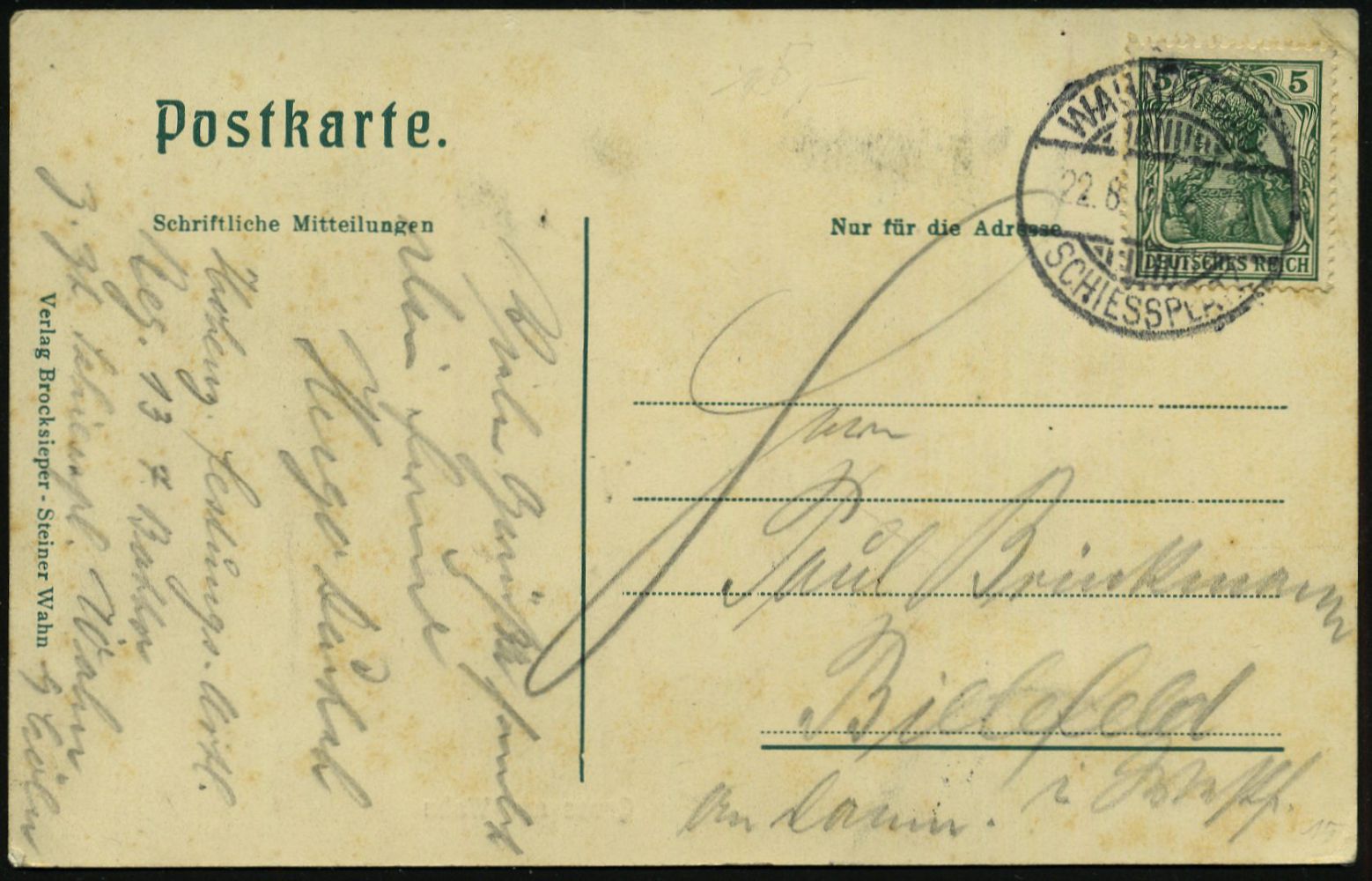 8890 | 14 € | 5000 KÖLN (Allgem. Teil, Tagesstempel, Ganzsachen etc.) : Köln-Wahn 1907 (22.8.) 1K-Gitter: WAHN (Rheinl.)-/SCHIESSPLATZ auf s/w.-Foto-Ak.: Gruss aus Wahn, Geschützstellung (schweres Geschütz) klar gest. Bedarfs-Fernkt. n. Bielefeld (Bo.85) | ![]() ![]() | |