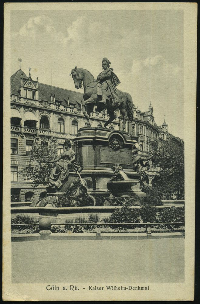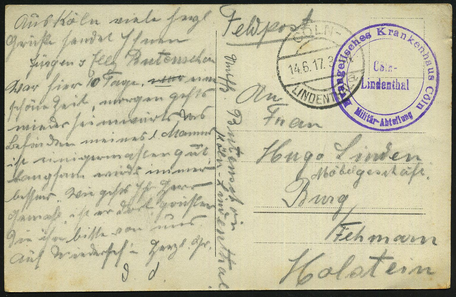 8896 | 12 € | 5000 KÖLN (Allgem. Teil, Tagesstempel, Ganzsachen etc.) : Köln-Lindenthal 1917 (14.6.) 1K-Brücke: CÖLN-/LINDENTHAL/a + viol. 2K-HdN: Evangelisches Krankenhaus Cöln/Militär-Abteilung + hs. Abs., s/w.-Feldpost-Ak.: Kaiser Wilhelm-Denkmal (Wilhelm I. zu Pferd) n. Burg/Fehmarn | ![]() ![]() | |
