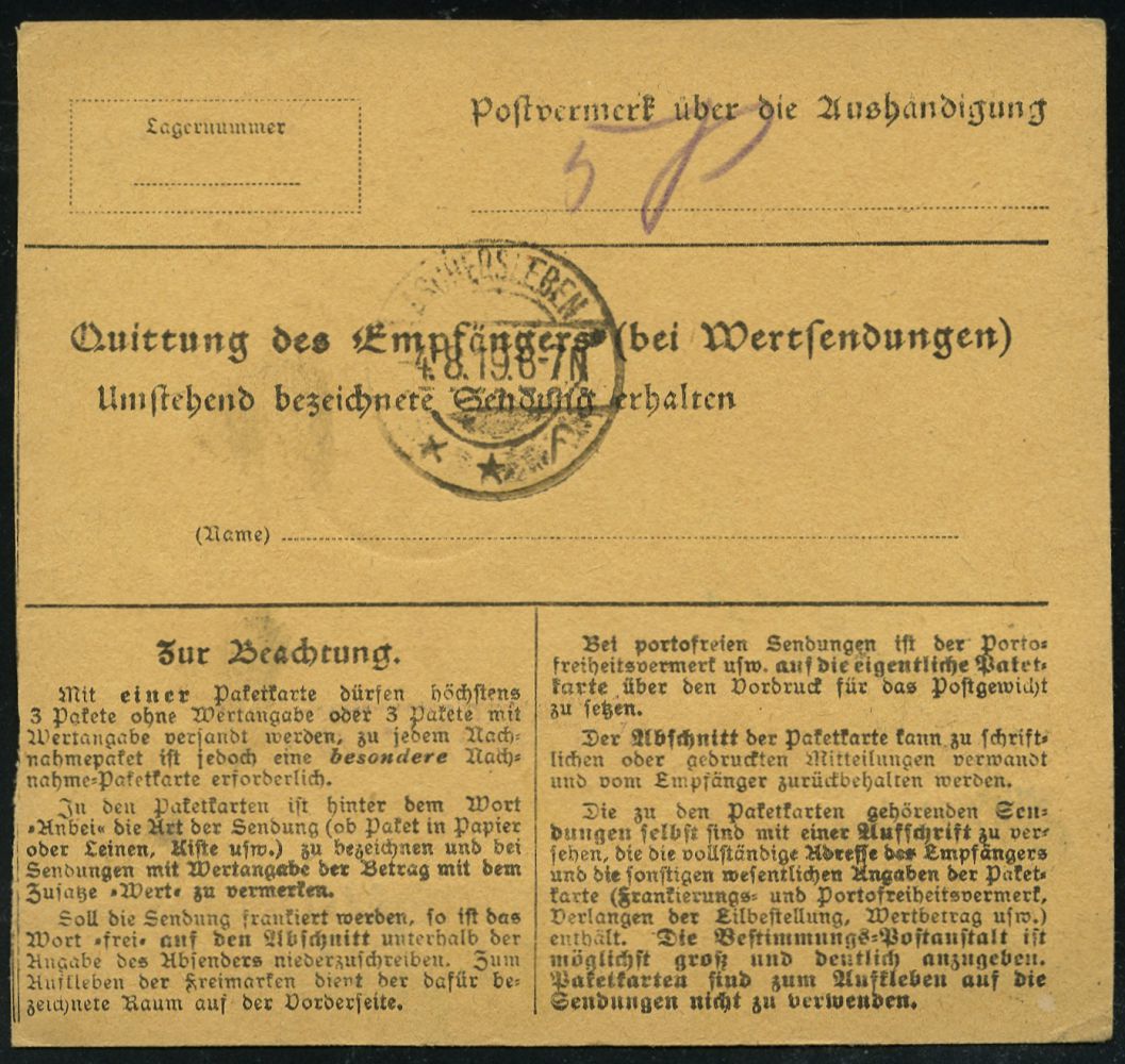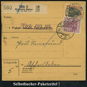 8898 | 18 € | 5000 KÖLN (Allgem. Teil, Tagesstempel, Ganzsachen etc.) : Köln 3 1919 (31.7.) 1K-Gitter: CÖLN/* 3 c auf Germania 25 Pf. u. 60 Pf. + schw. Selbstbucher-Paketzettel: Cöln 3/Heinrich Mainz/Cöln Im Dau 4-6 (= Tabakfirma) klar gest. Wertpaketkt. 100.- Mk. n. Aschersleben (Mi.88 II, 92 II) | ![]() ![]() | |