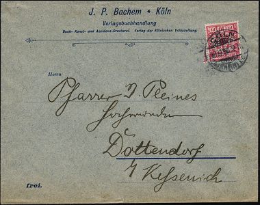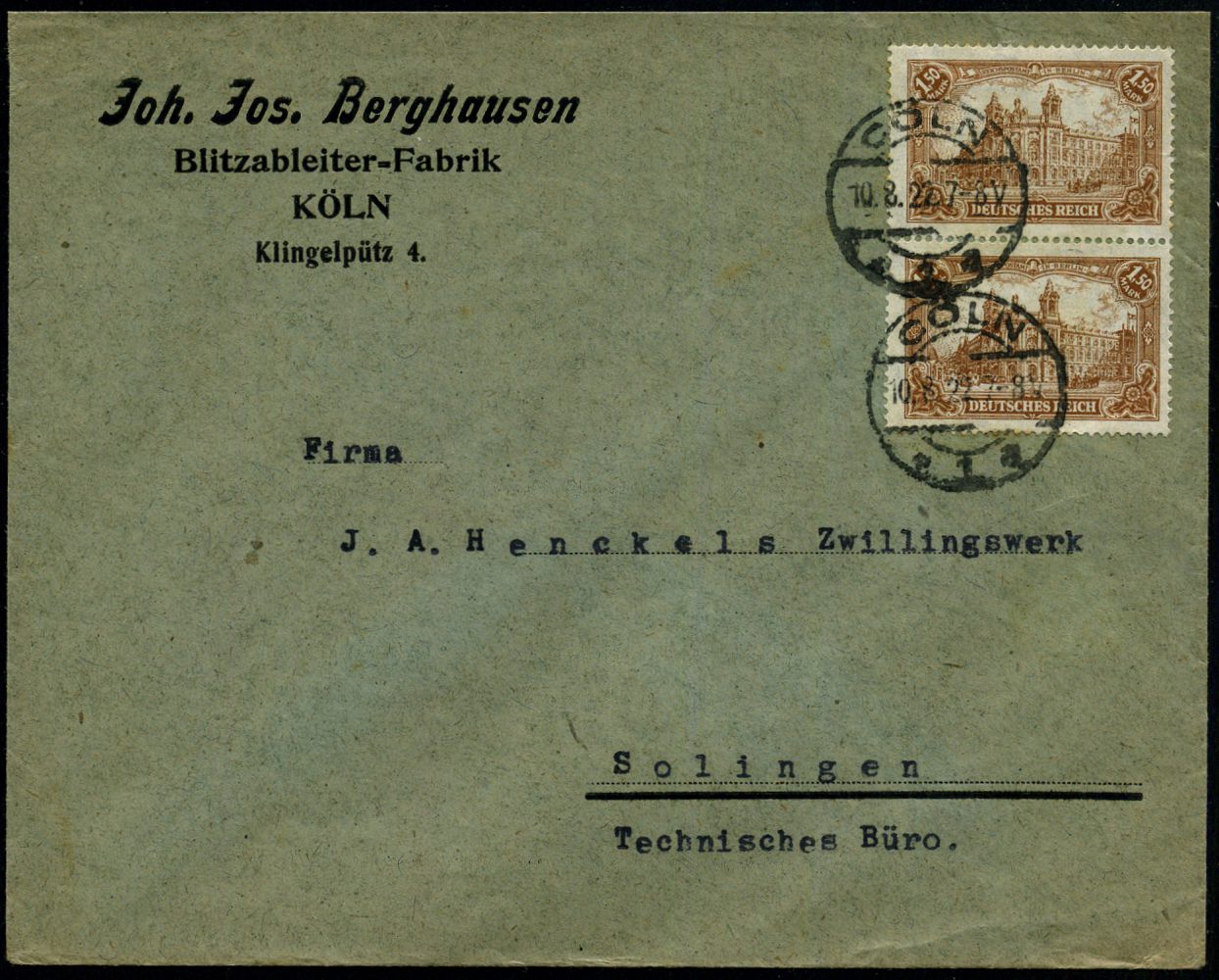 8900 | 18 € | 5000 KÖLN (Allgem. Teil, Tagesstempel, Ganzsachen etc.) : Köln 1 1922 (10.8.) 1K-Brücke: CÖLN/* 1 a auf senkr. Paar 1,50 Mk. Postmuseum Berlin, klar gest., portorichtiger Firmen-Fernbf.: Blitzableiter-Fabrik Jos. Berghausen (Mi.114 a , MeF) | ![]() | |