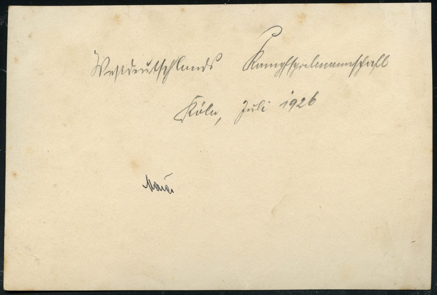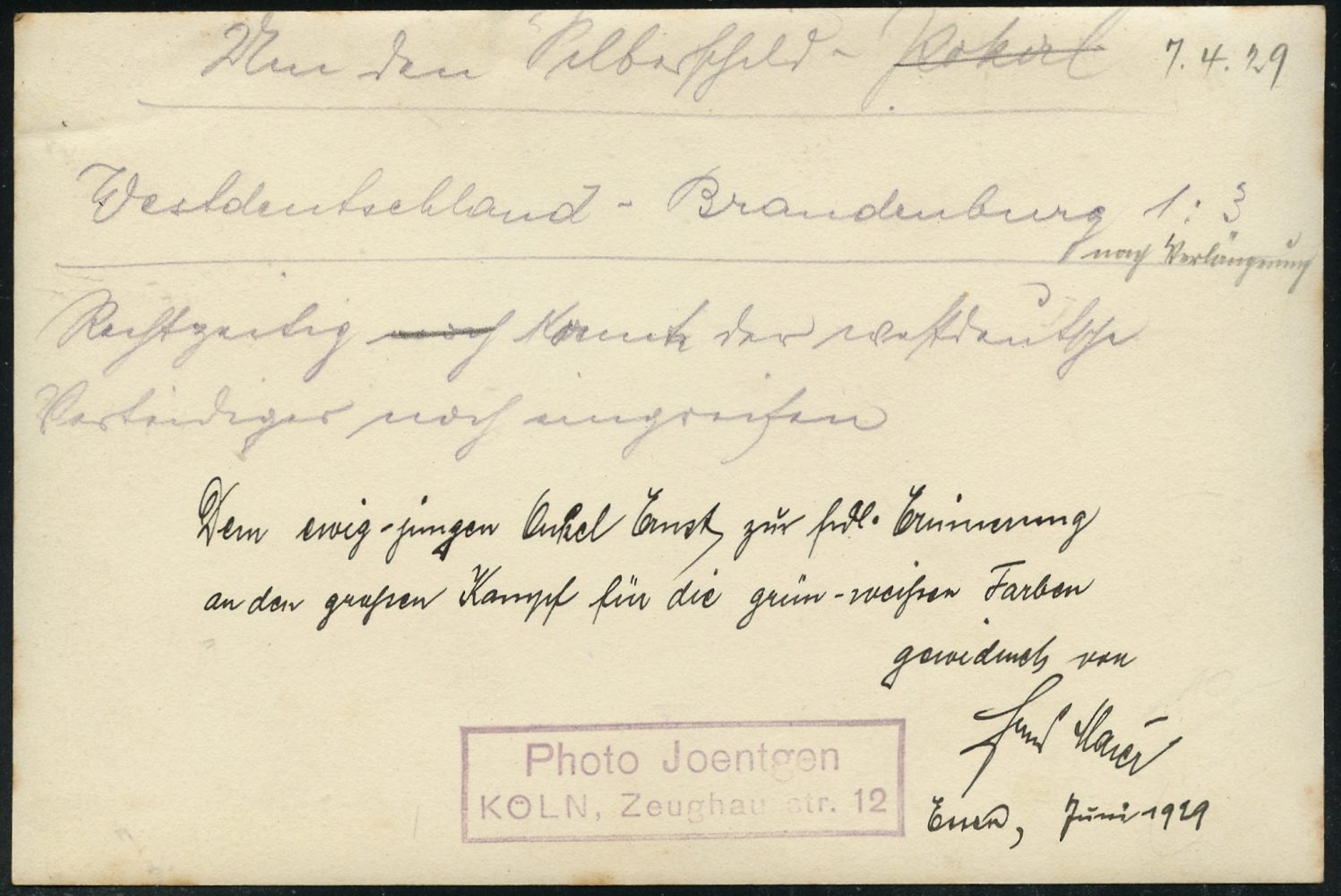 8902 | 12 € | 5000 KÖLN (Allgem. Teil, Tagesstempel, Ganzsachen etc.) : Köln 1926 (Juli) s/w.-Foto: Feldhockey-Mannschaft "Westdeutschland" , Uhv. C. Scholz, Köln-Deutz, vergl. Kat.-Nr.8904 (Format 16,8 x 11,4 cm) | ![]() ![]() | |