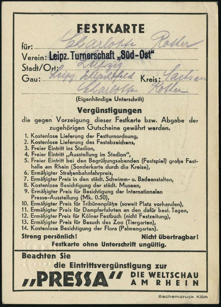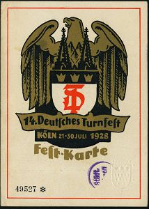 8903 | 25 € | 5000 KÖLN (Allgem. Teil, Tagesstempel, Ganzsachen etc.) : Köln 1928 (Juli) amtl. Teilnehmer-Fest-Karte: 14. Deutsches Turnfest Köln für Teilnehmer (goldener Adler, Wappen "D T" , Domtürme) mit Blind-Präge-Stadtwappen, rs. 1L: Leipz. Turnerschaft "Süd-Ost", seltenes Dokument! | ![]() ![]() | |
