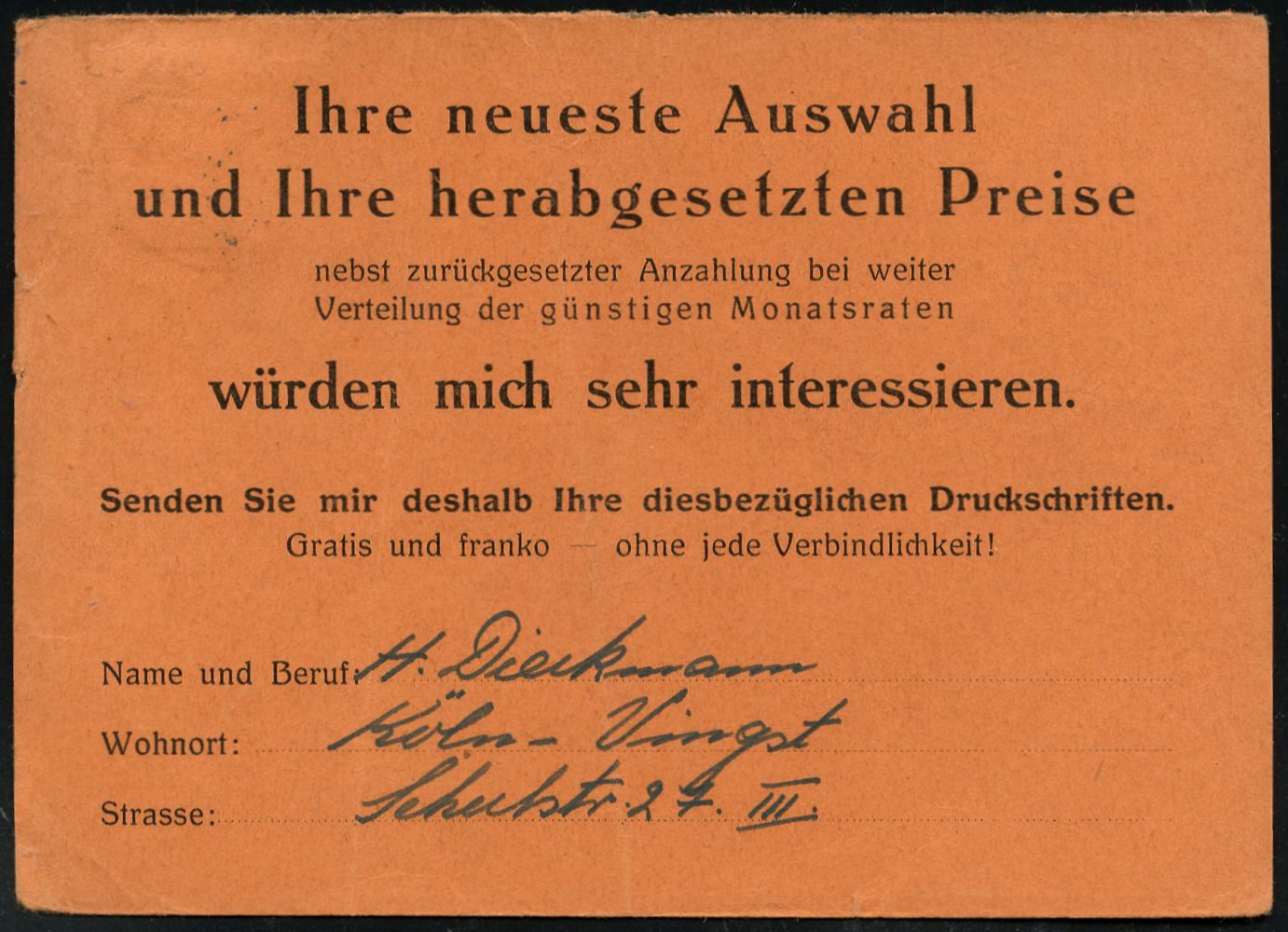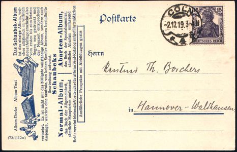 8899 | 16 € | 5000 KÖLN (Allgem. Teil, Tagesstempel, Ganzsachen etc.) : Köln 1919 (2.12.) 1K-Gitter: CÖLN/* 4 q auf EF 15 Pf. Germania , blaue Reklame-Kt.: Schaubek-Album (vs./rs.) n. Hannover (Mi.101 EF) | ![]() ![]() | |