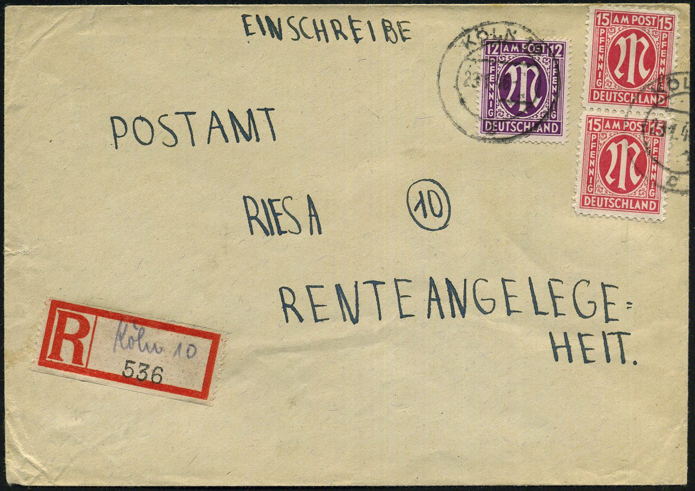 8914 | 18 € | 5000 KÖLN (Allgem. Teil, Tagesstempel, Ganzsachen etc.) : KÖLN 10/ c 1946 (23.1.) 2K-Steg auf AM-Post-Frankatur 12 Pf. u. Paar 15 Pf. + provis. RZ: Köln 10 = hs. Eintrag auf Blanco-RZ = Notmaßnahme , seltener Fern-R-Bf. in die SBZ n. Riesa, rs. AS. | ![]() | |
