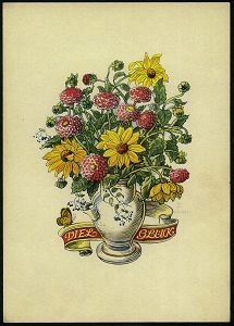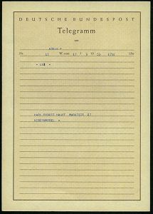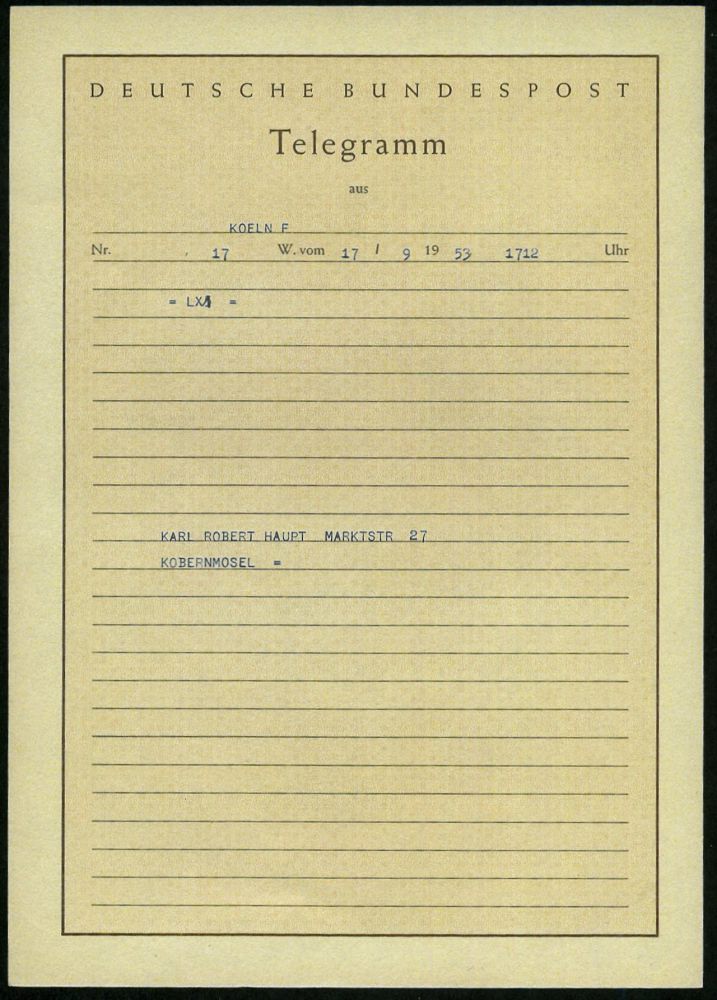 8916 | 16 € | 5000 KÖLN (Allgem. Teil, Tagesstempel, Ganzsachen etc.) : Köln 1953 (14.9.) Schmuckblatt-Telegramm: VIEL GLÜCK = Blumen-Vase mit Schmetterling (rs. Postbote mit Rosen-Strauss) Fern-Telegramm aus Köln n. Kobern/Mosel, gute Erhaltung (C 187 LX 1 / große Schrift) | ![]() ![]() ![]() | |