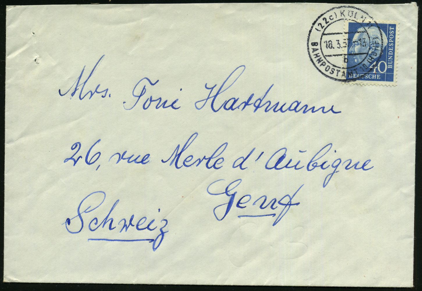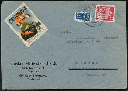 8917 | 12 € | 5000 KÖLN (Allgem. Teil, Tagesstempel, Ganzsachen etc.) : (22c) KÖLN 1/ b/ BAHNPOSTAMT 10 (H B H F) 1957 (18.3.) 2K-Steg auf EF 40 Pf. Heuss II , klar gest. Ausl.-Bf. (Mi.260 EF) | ![]() | |
