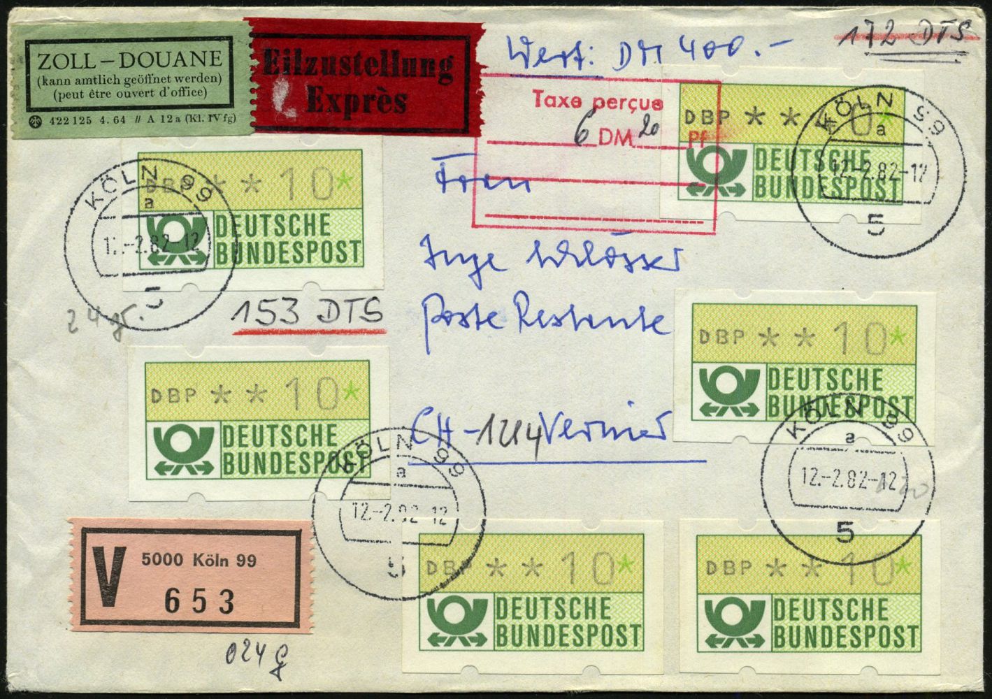 8926 | 18 € | 5000 KÖLN (Allgem. Teil, Tagesstempel, Ganzsachen etc.) : 5 KÖLN 99/ a 1982 (12.2.) 1K-Segment auf ATM-Frankatur + roter Ra.3.: Taxe percue mit 3 Zeilen + roas V-Zettel: 5000 Köln 99 + grüner Zollzettel, Ausl.-Eil-Wert-Bf. 400.- DM in die Schweiz, rs. TS (Mi.1) | ![]() | |