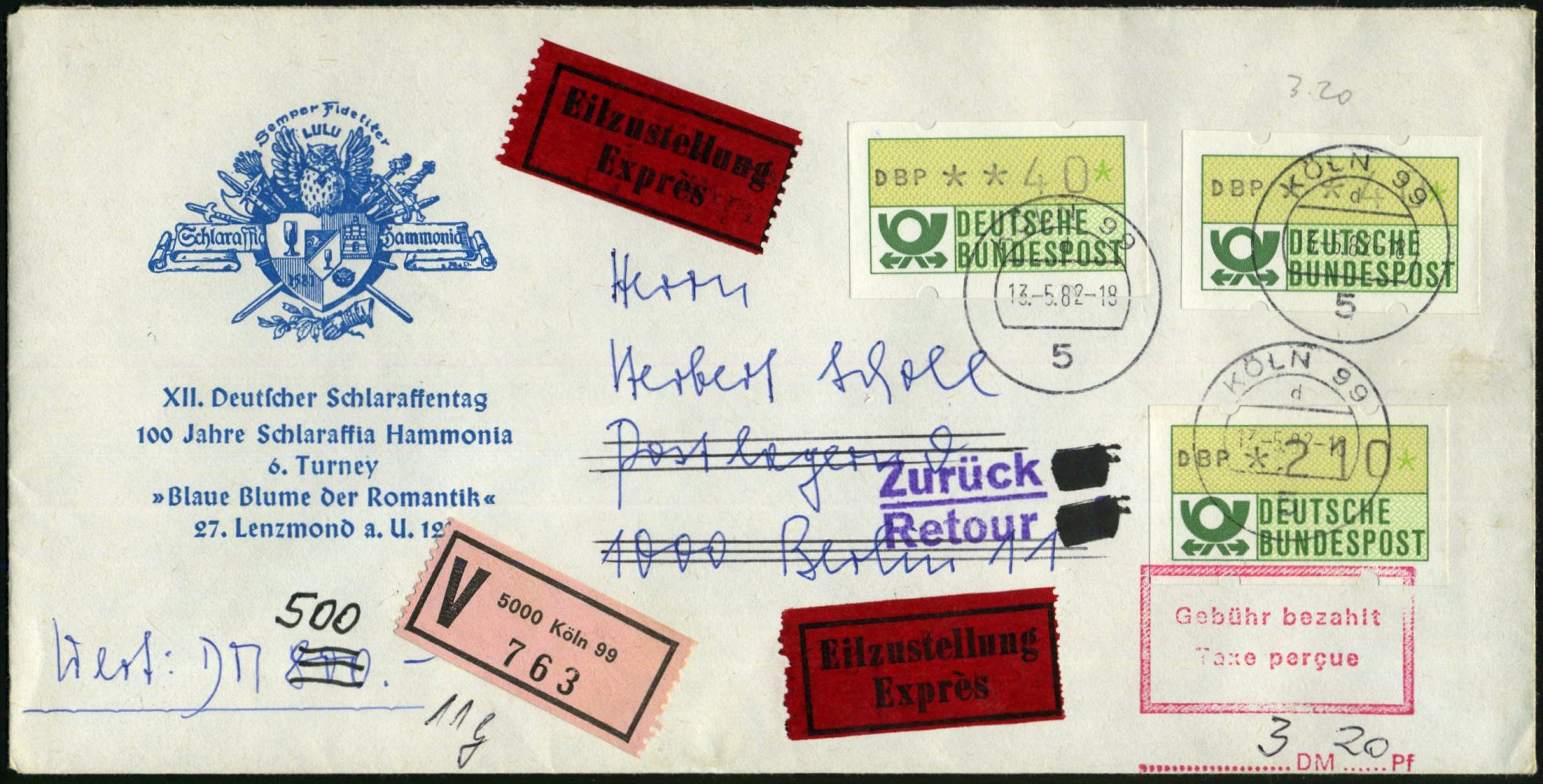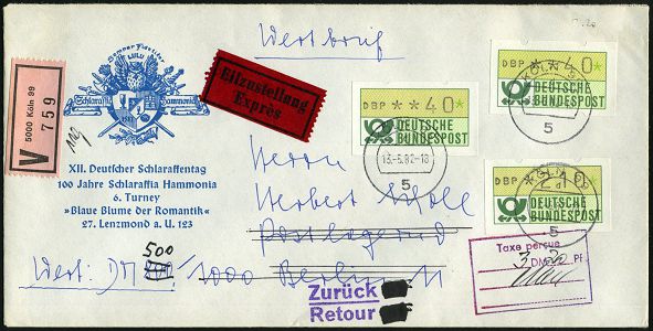8929 | 20 € | 5000 KÖLN (Allgem. Teil, Tagesstempel, Ganzsachen etc.) : 5 KÖLN 99/ d 1982 (13.5.) 1K-Segment auf ATM 2x 40 Pf. u. 210 Pf. + viol. Ra.3 mit 3 Linien: Taxe percue/DM___Pf. (hs. 3,20 DM) + roa VZ: 5000 Köln 99, klar gest. Sonderumschlag: XII. Deutscher Schlaraffentag "100 Jahre Schlaraffia Hammonia".., seltener Fern-Eil-Wert-Retour-Bf. 500.- DM n. West-Berlin, div. TS. u. AS. (Mi.1 + MiF "Taxe percue") | ![]() ![]() | |