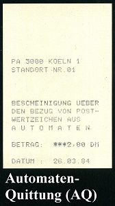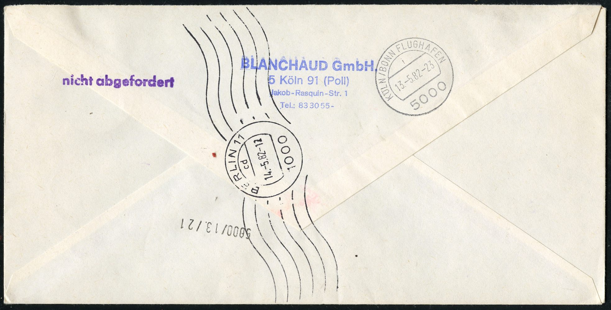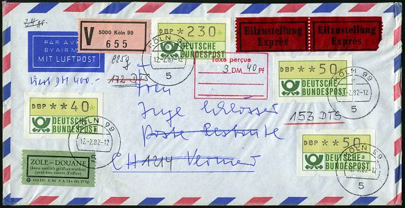 8927 | 20 € | 5000 KÖLN (Allgem. Teil, Tagesstempel, Ganzsachen etc.) : 5 KÖLN 99/ a 1982 (12.2.) 1K-Segment auf ATM-Frankatur + roter Ra.3: Taxe percue.. + V-Zettel: 5000 Köln 99 + grüner Zollaufkleber, rs. TS: 5000 KÖLN-BONN FLUGHAFEN auf Ausl.-Flp.-Eil-Retour-Wert-Bf. 400.- DM in die Schweiz (Mi.1) | ![]() | |